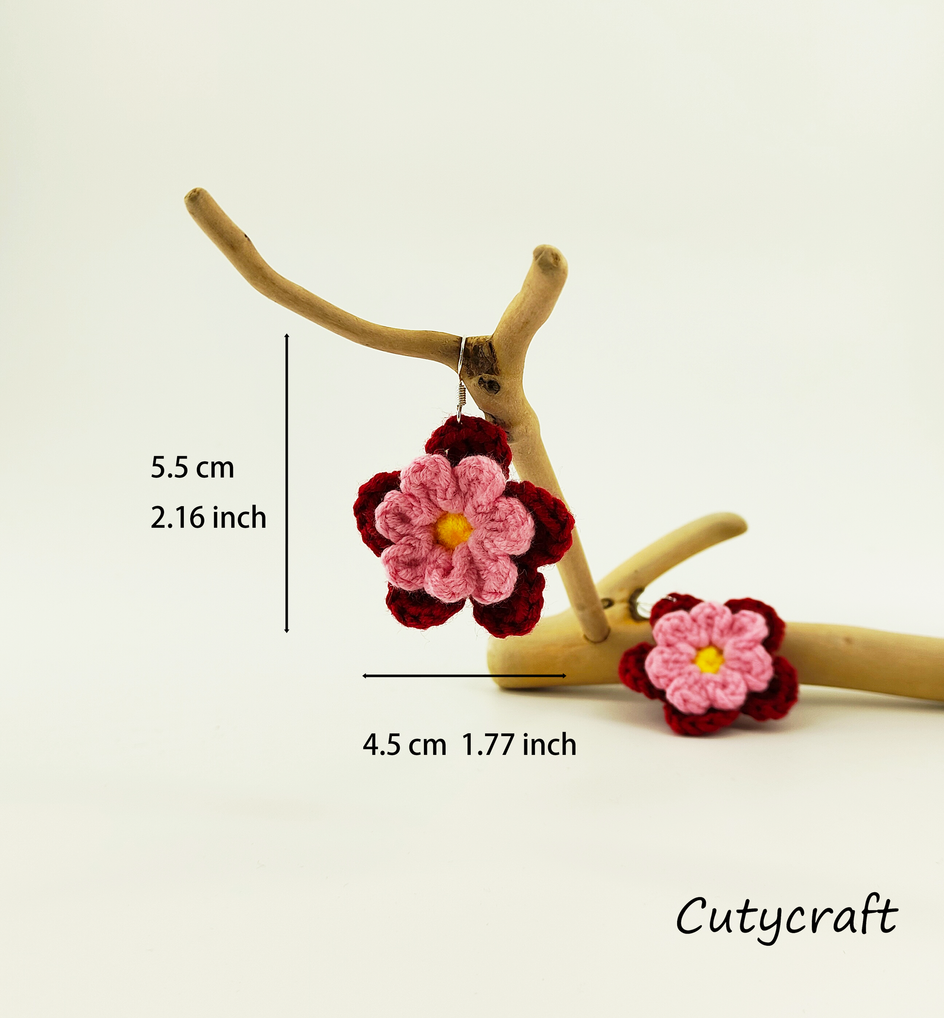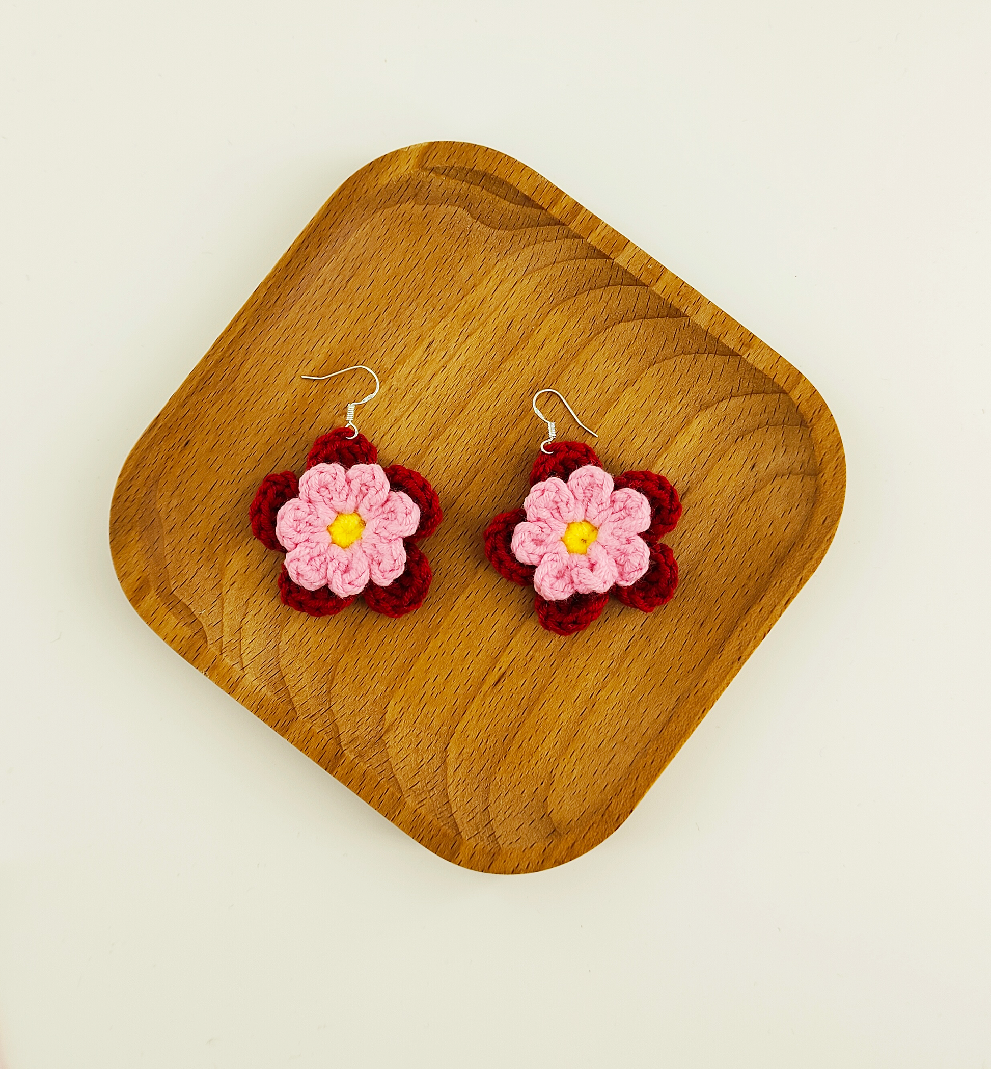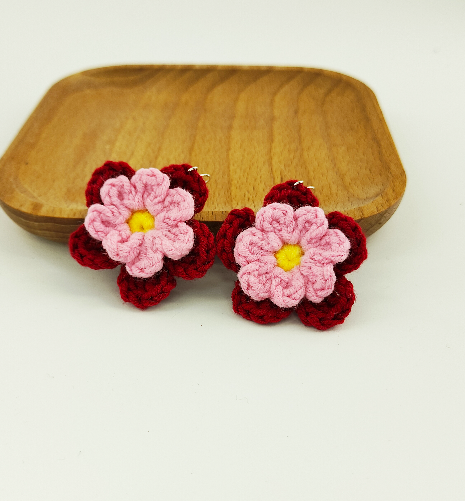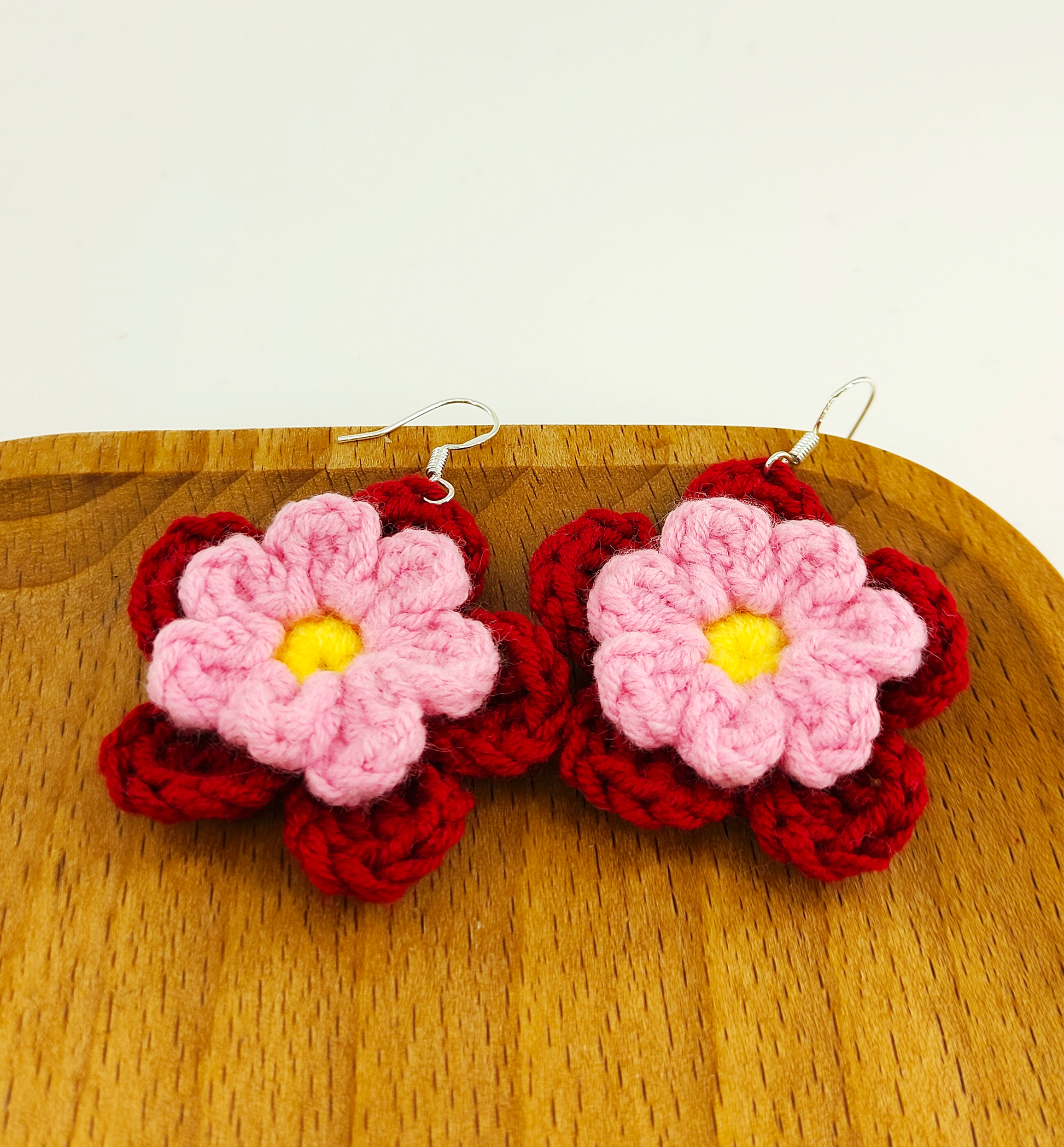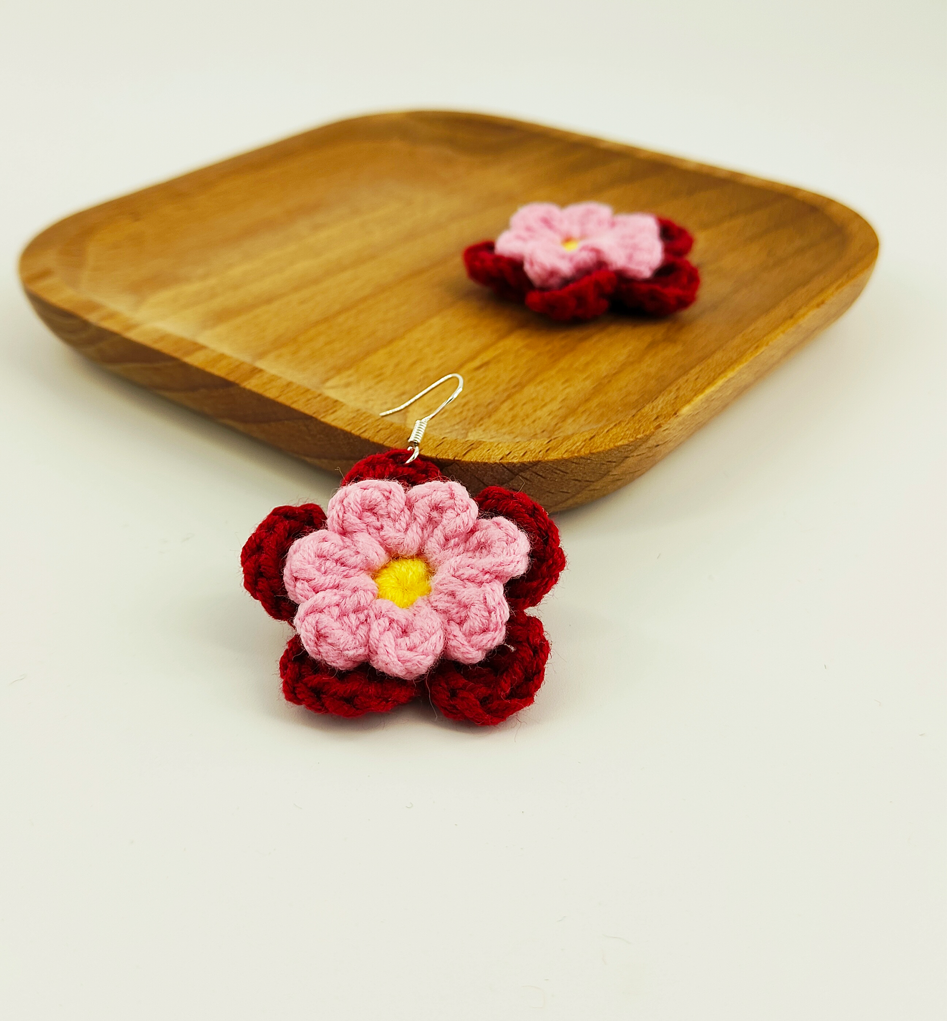 - This pair of floral earrings is characterized by its dual-layered petal design. The bottom layer features a deep red color, while the top layer is in a soft pink shade. The flower center is adorned with a vibrant egg yolk yellow. The intricate layering and harmonious color combination make these earrings stand out, exuding elegance and enchanting charm.